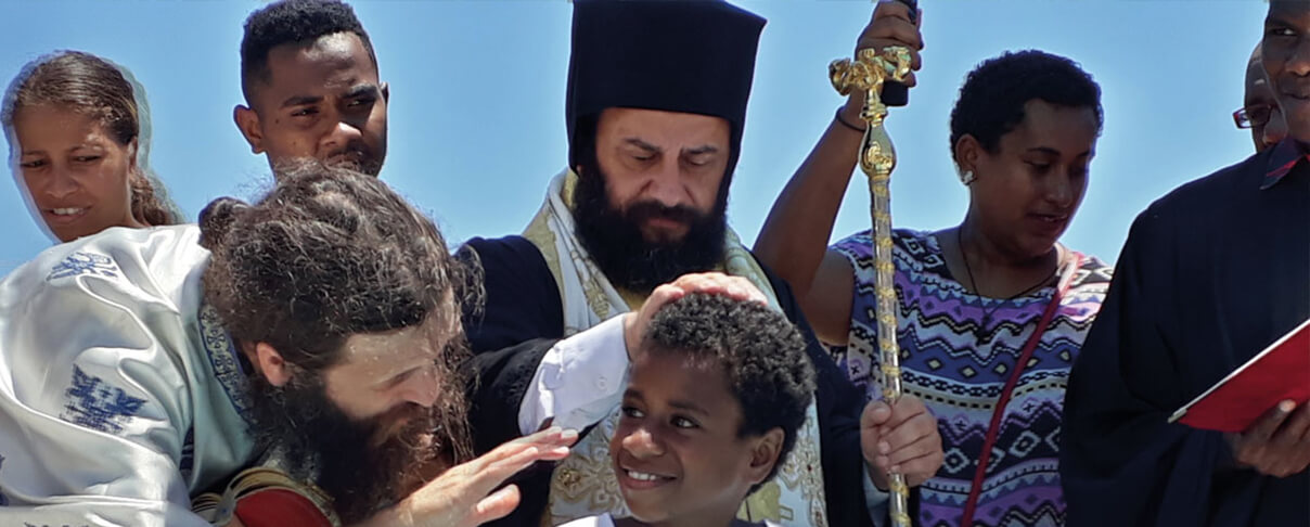 Μια μέρα μας προσκάλεσε η νεοβαφτισμένη μας Σωφρονία να επισκεφθούμε την οικογένειά της στο νησί Γιασάουα Ίρα ‘Ιρα όπου μένει. Όλα έδειχναν ωραία από τη στιγμή που επιβιβαστήκαμε στο καταμαράν και, αφήνοντας πίσω μας το λιμάνι της Νάντης, αρχίσαμε να προσεγγίζουμε το ένα μετά το άλλο τα πανέμορφα νησάκια. Μόλις προσεγγίζαμε τα νησιά οι βάρκες πλεύριζαν το πλοίο μας, είτε για να φέρουν, είτε για να πάρουν επιβάτες και αποσκευές. Νόμιζα ότι αυτό γινόταν μόνο στα μικρά νησιά και ότι στο δικό μας θα είχε κάποια αποβάθρα να προσαράξει το πλοίο. Διαψεύστηκα όμως τελικά, αφού μετεπιβιβαστήκαμε σε μία από τις βάρκες με τελικό προορισμό το Γιασάουα Ίρα Ίρα. Ήμασταν μέσα οκτώ άτομα. Όσο περισσότερο προχωρούσαμε, τόσο ο Ειρηνικός Ωκεανός αγρίευε, και ο αέρας φύσαγε ορμητικά φουσκώνοντας επικίνδυνα. Στην αρχή το διασκεδάζαμε. Όταν, όμως, είδαμε ότι περνούσαμε τον έναν κάβο μετά τον άλλο και λιμάνι δεν φαινόταν πουθενά, αρχίσαμε να ανησυχούμε. Το θαλασσινό νερό μάς είχε εν μέρει τυφλώσει. Άρχισα να ανησυχώ. Η μόνη καταφυγή σε τέτοιες στιγμές είναι η προσευχή. Έψαλα την Παράκληση στην Παναγία μας «Πρός τίνα καταφύγω ἄλλην, Ἁγνή. Ποῦ προσδράμω λοιπόν καί σωθήσομαι, ποῦ πορευθῶ; Ποίαν δέ ἐφεύρω καταφυγήν;». Μετά από υπεράνθρωπη προσπάθεια, πλησιάσαμε στην παραλία. Ούτε λιμάνι ούτε χωριό. Χρειάστηκε να περάσουμε πολλούς ακόμη κάβους και τελικά μετά από τέσσερις ώρες πάλης με τα κύματα, βγήκαμε μισοκολυμπώντας στην κάτασπρη αμμουδιά. Με τη χάρη του Θεού η οικογένεια της Σωφρονίας, αλλά και οι 300 συγχωριανοί της, μας καλωσόρισαν και μας φιλοξένησαν με ιδιαίτερη χαρά. Άξιζε, λοιπόν, τον κόπο να γίνει αυτό το περιπετειώδες ταξίδι. Η Ορθοδοξία έφτασε και σε αυτό το απόμερο νησί προς δόξαν Θεού.